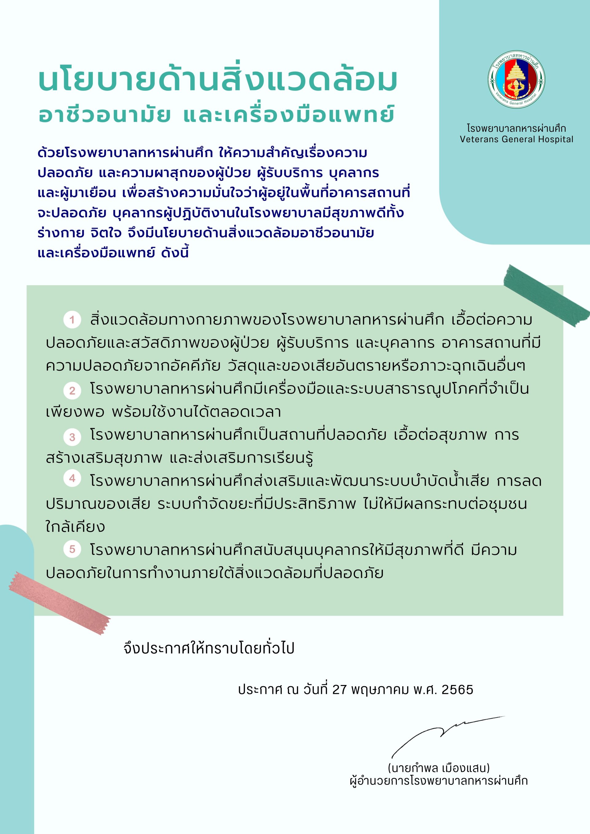 ๑. ตามที่ รพ.ผศ. มีการพัฒนาคุณภาพงานด้านสิ่งแวดล้อม อาชีวอนามัย และเครื่องมือแพทย์ ของ รพ.ผศ. ให้ได้มาตรฐาน เอื้อประโยชน์ต่อการรักษาพยาบาลและการให้บริการของ รพ.ผศ. อย่างมีประสิทธิภาพ นั้น