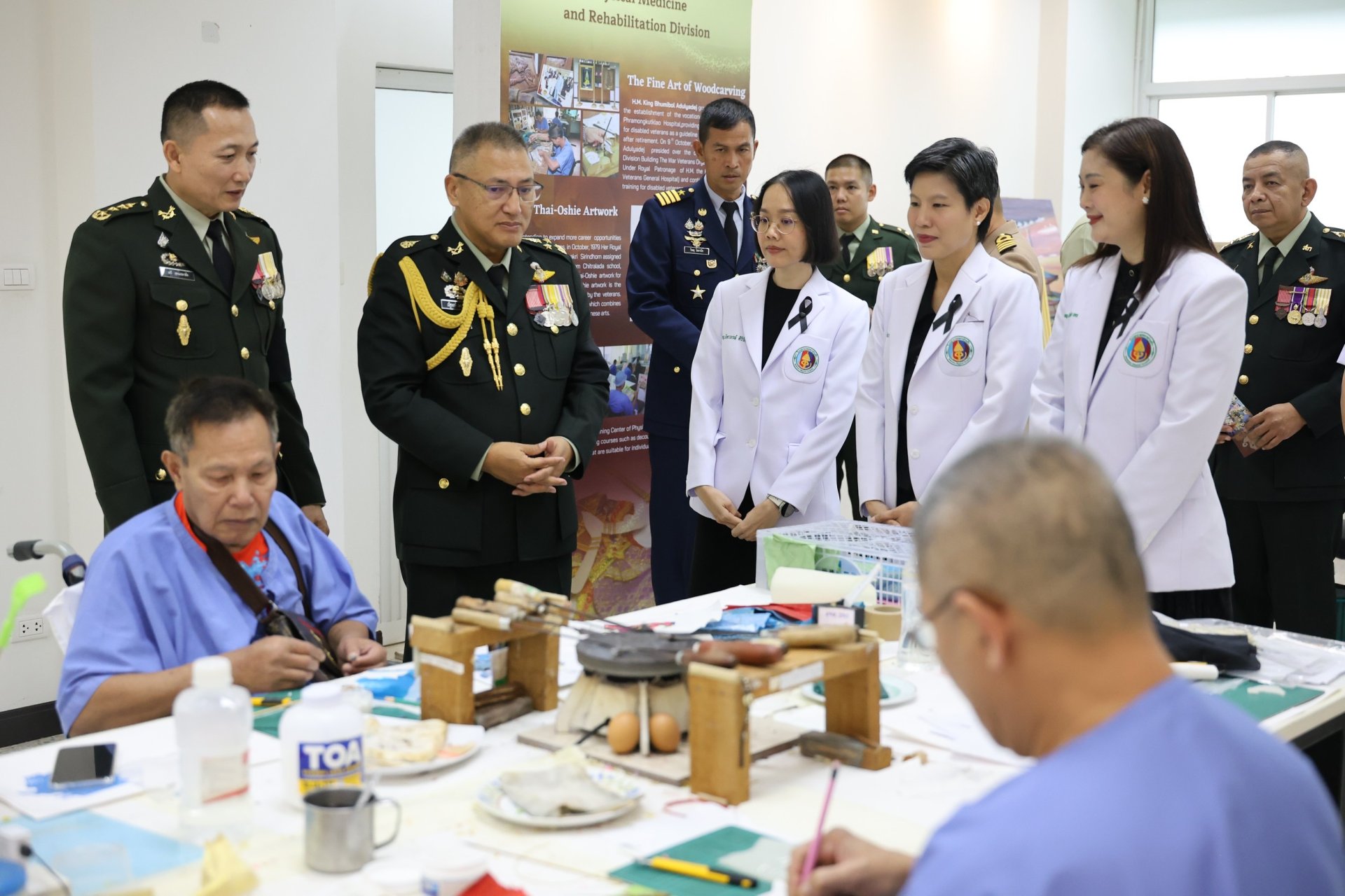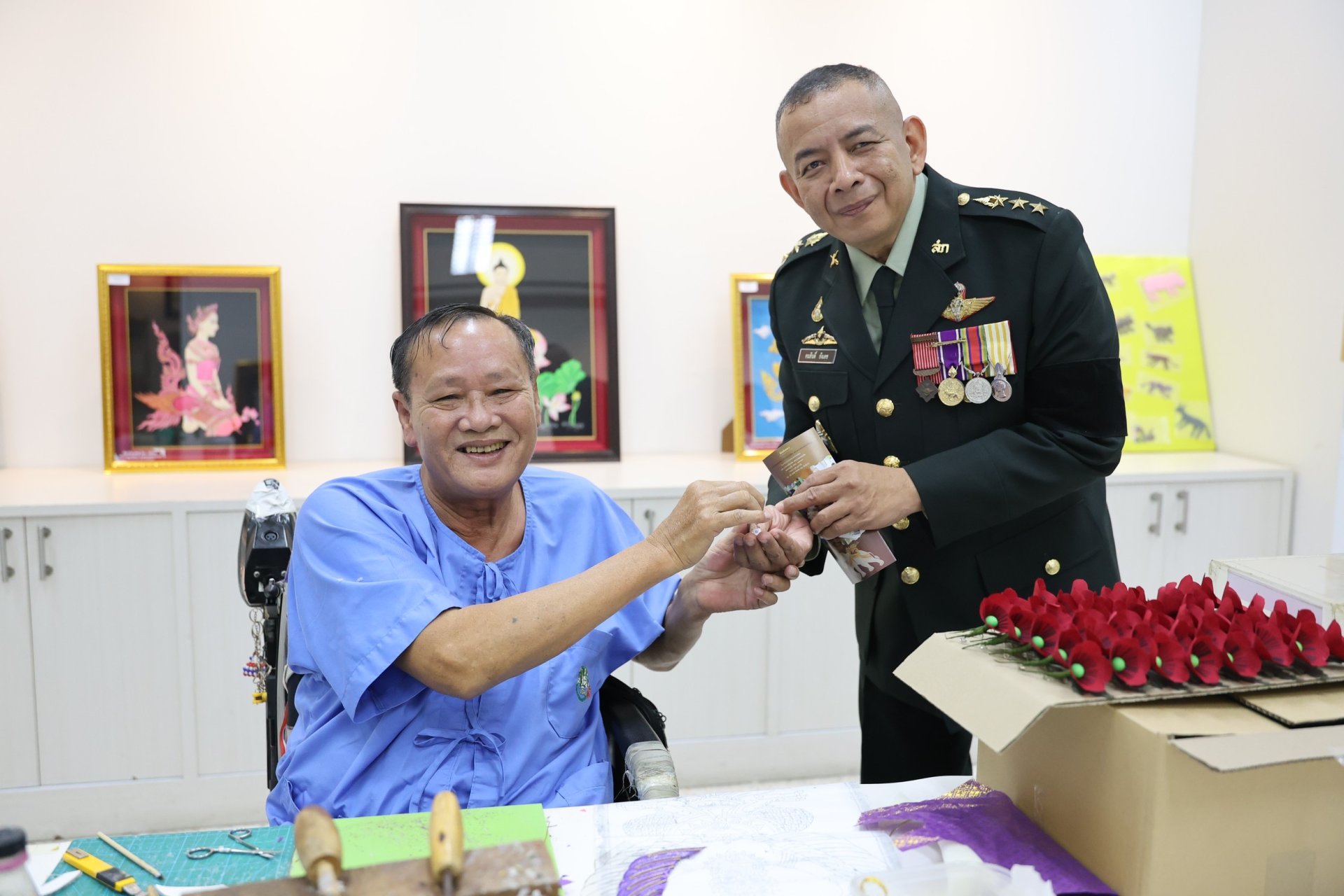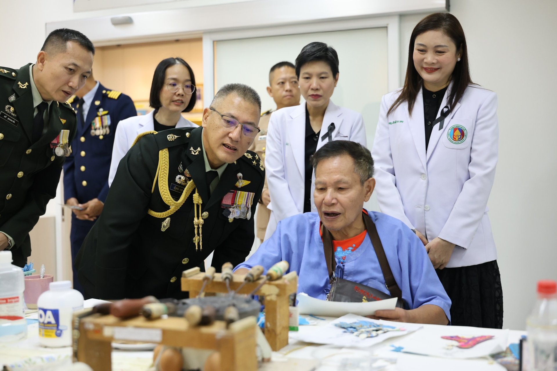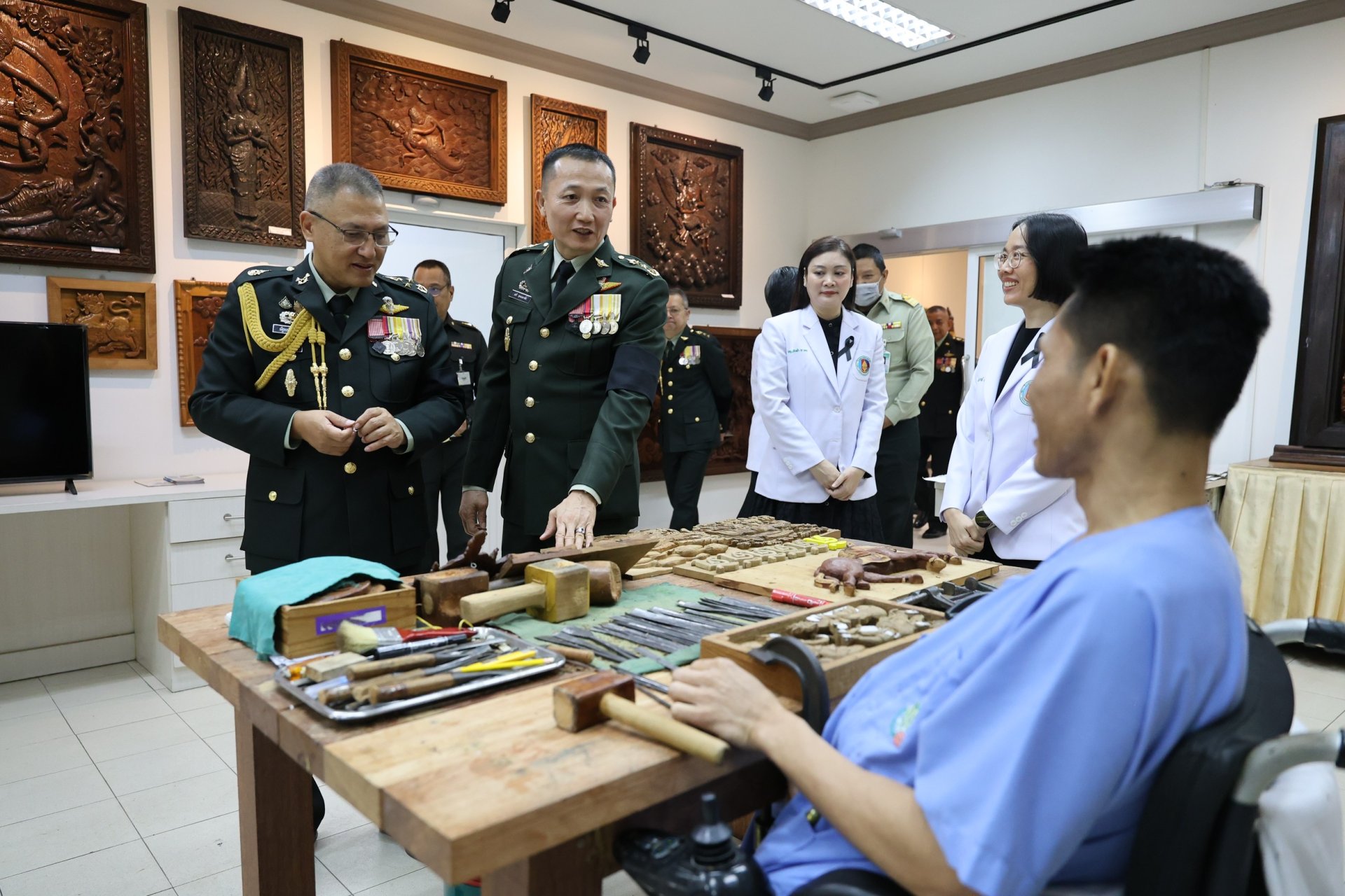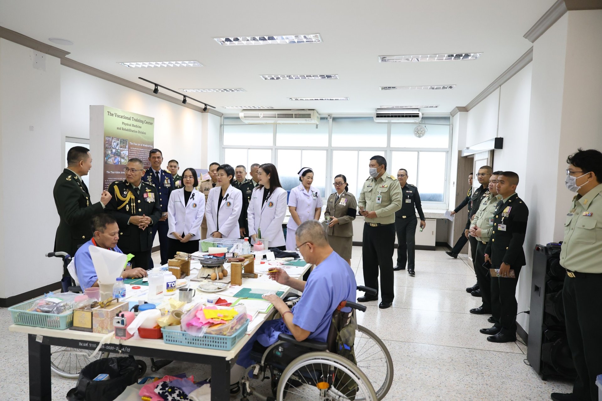 นอกจากนี้ ยังได้เยี่ยมชมศูนย์กิจกรรมบำบัดและฝึกอาชีพ โรงพยาบาลทหารผ่านศึก รวมทั้งร่วมพูดคุยเพื่อสร้างขวัญกำลังใจให้แก่ทหารผ่านศึก