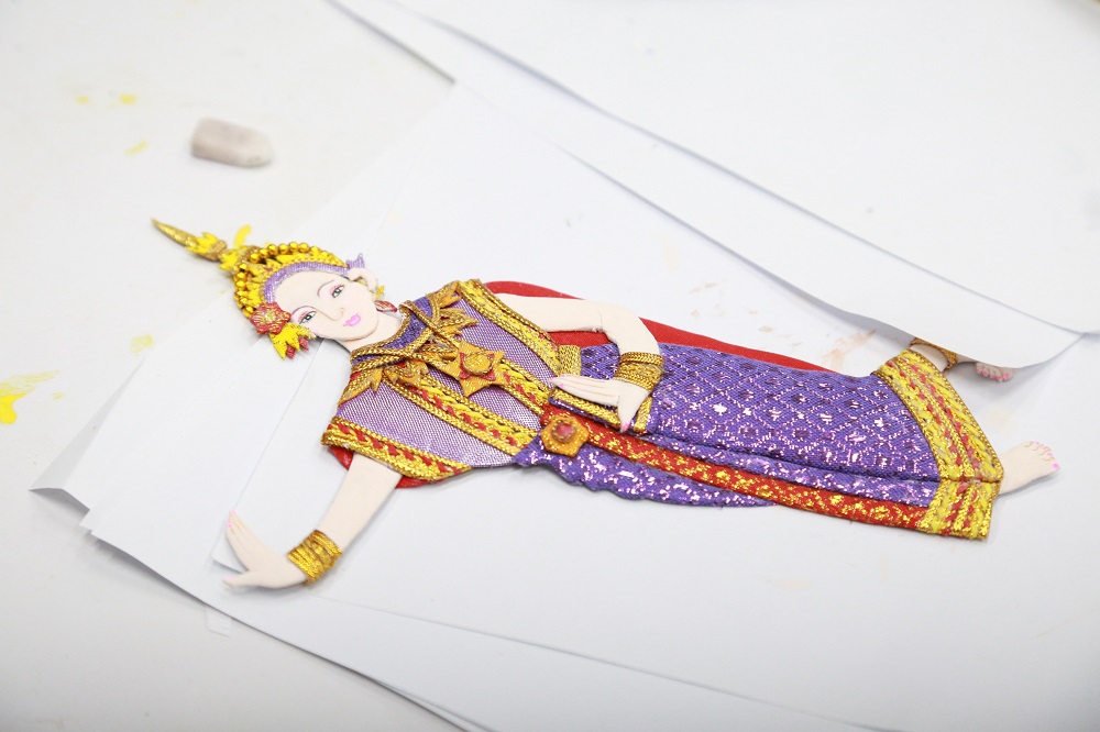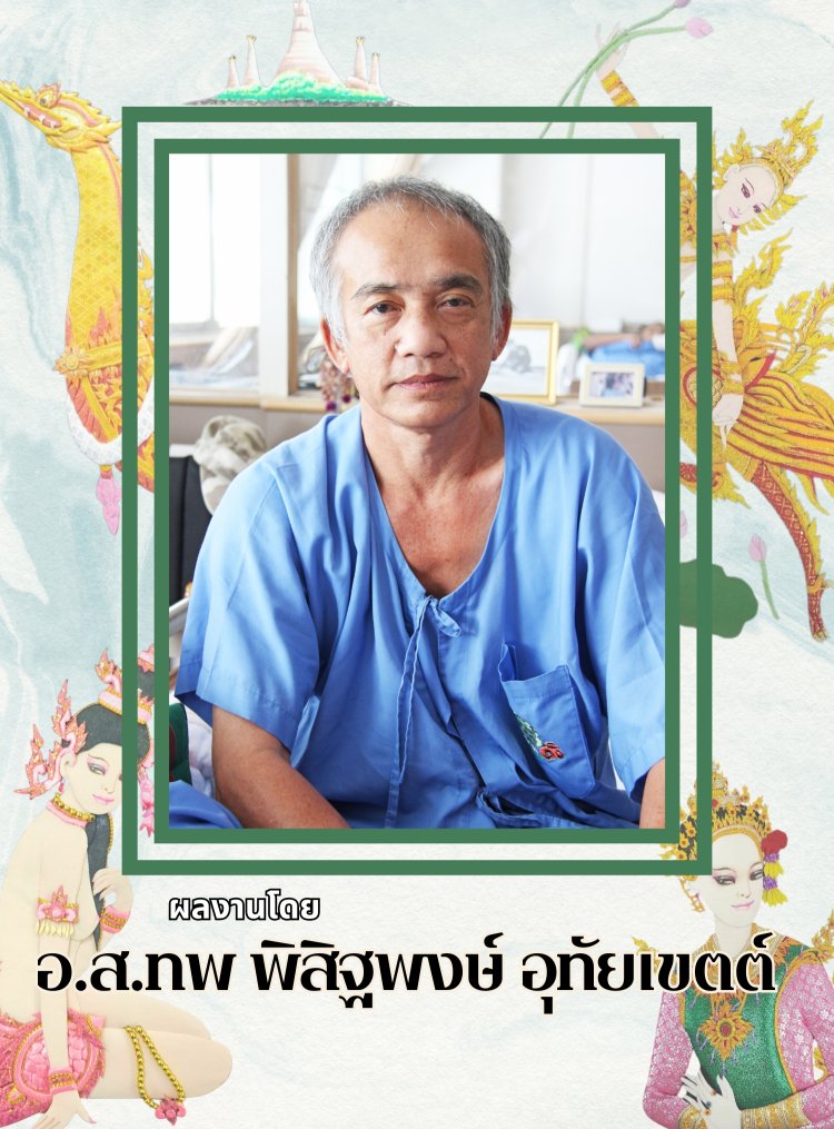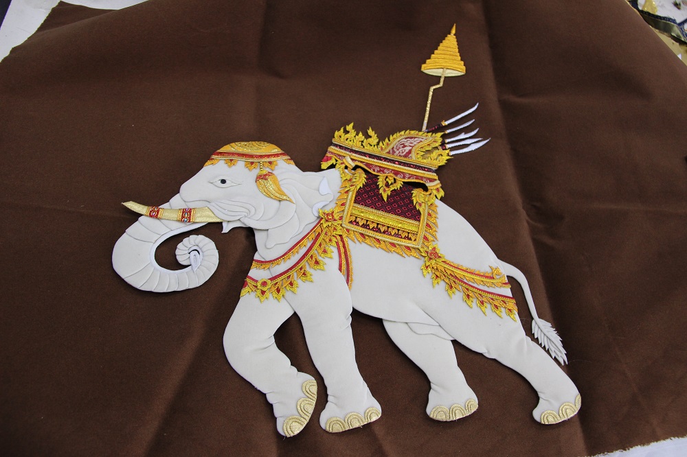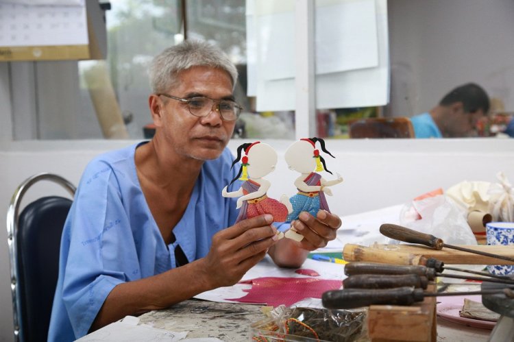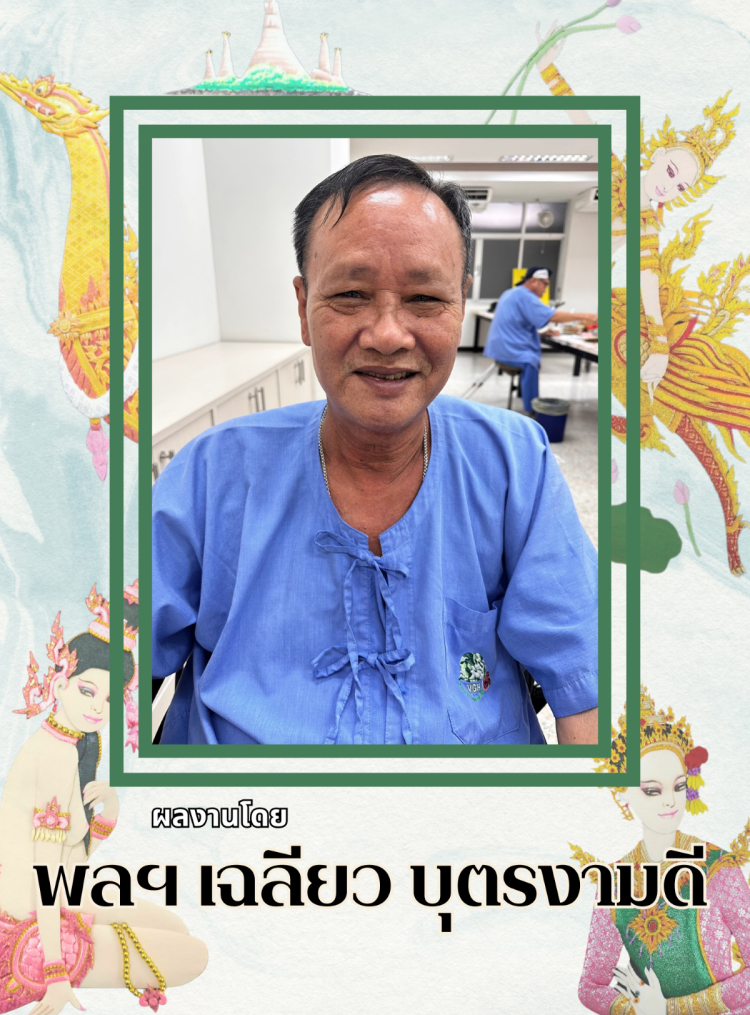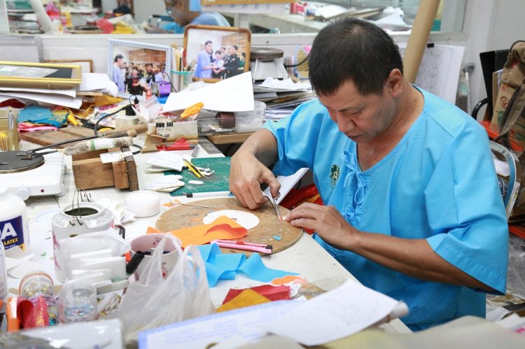 โดย สมเด็จพระกนิษฐาธิราชเจ้า กรมสมเด็จพระเทพรัตนราชสุดาฯ สยามบรมราชกุมารี ทรงมีรับสั่งขอให้ อาจารย์ เทรุโอะ โยมูระ อาจารย์ชาวญี่ปุ่น ผู้มีความสนใจและชื่นชอบในศิลปะของไทยเป็นอย่างมาก และเป็นอาจารย์ผู้สอนวิชาวาดเขียนในโรงเรียนจิตรลดา มาช่วยสอนงานศิลปะ ที่ผสมผสานระหว่างศิลปะญี่ปุ่นและศิลปะไทย ที่เรียกว่า ศิลปประดิษฐ์ไทย–โอชิเอะ ให้แก่ทหารผ่านศึกพิการทุพพลภาพ เพิ่มขึ้นจากงานแกะสลักไม้วิจิตรศิลป์อีกแขนงหนึ่ง ซึ่งถือได้ว่าศิลปะแขนงนี้ต้องใช้ความประณีตและความคิดสร้างสรรค์เป็นอย่างมาก ในการออกแบบผลงานแต่ละชิ้น มีขั้นตอนและวิธีทำที่ละเอียดอ่อนมาก ศิลปประดิษฐ์ไทย–โอชิเอะต้องอาศัยการประดิษฐ์ขึ้นด้วยมือและความคิดสร้างสรรค์ของผู้สร้างผลงาน โดยผู้ประดิษฐ์ศิลปประดิษฐ์ไทย–โอชิเอะจะทำชิ้นส่วนต่างๆ ทีละชิ้น ห่อหุ้มชิ้นส่วนให้สวยงามด้วยผ้าไทยลายต่างๆ ซึ่งผู้ประดิษฐ์สร้างสรรค์ให้เป็นส่วนประกอบแต่ละส่วนที่เสมือนจริงที่สุด ไม่ว่าจะเป็นใบหน้า อวัยวะส่วนต่างๆ เครื่องนุ่งห่ม หรือส่วนประกอบอื่นๆ และนำมาประกอบกันเป็นภาพนูนสูงสามมิติตามรูปแบบที่กำหนดไว้ ซึ่งภาพศิลปประดิษฐ์ไทย–โอชิเอะที่เป็นที่นิยมและมีความต้องการในตลาดสูง อาทิ ภาพทางศาสนา ภาพวิวทิวทัศน์ ภาพตัวละครในวรรณคดีต่างๆ ภาพประเพณีไทย รวมไปถึงบริการผลิตภาพตามความต้องการของผู้ประสงค์ต้องการซื้อภาพอีกด้วย ซึ่งระยะเวลาในการผลิตภาพศิลปประดิษฐ์ไทย–โอชิเอะขึ้นอยู่กับความละเอียดของภาพ ขนาดของภาพ และความชำนาญของผู้ผลิต เนื่องจากภาวะทางสภาพร่างกาย บางชิ้นงานอาจใช้เวลาถึง 2 สับดาห์ หรือมากกว่านั้น